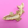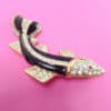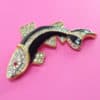 A stunning large 1980s vintage “flying fish” brooch. This lovely black enamel and gold metal brooch features lots of shiny clear glass rhinestones and a red glass eye.