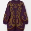 1980s vintage St Michael oversized cardigan in purple, made in UK. This oversized 80s cardigan by St Michael in deep purple features a gold, red and teal abstract pattern, has edge to edge with no fastenings, has shoulder pads and is made in the UK from a heavyweight mohair blend.