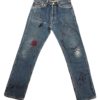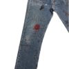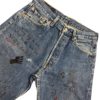 Y2K / 00s customised Levis 501s mid blue stonewash denim jeans with epic artwork on the front legs including skull and cross bones and paint splatters. These are really unique 501s but still come with the classic red Levis tab and rear patch.
