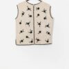 60s vintage sequin vest in cream and black. This beautiful 1960s cream vest features iridescent sequins, a black beaded pattern on the front and back and black beads along the trim. This vest also features a three quarter length zip closure on the back and is made from a heavyweight synthetic blend.