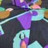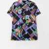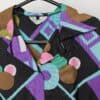 70s vintage shirt tunic top in black with colourful pattern. This 1970s black tunic top features a bright, colourful abstract pattern, an open collar, short sleeves, a full length button closure and two pockets above the hem. Made from a mid-weight synthetic material.