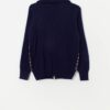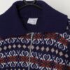 70s vintage zip up sweater in blue with collar, made in England. This 1970s blue sweater features a geometric and floral pattern on the front, a large collar, a full length zip closure and a stretchy hem for a personal fit. Made in England from a mid-weight synthetic blend.