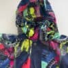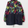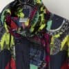 80s vintage deadstock multicoloured rain jacket with abstract clock print. This amazing 1980s colourful rain jacket features a bright clock and springs abstract pattern on the sleeves and chest. This jacket also features long sleeves, two side pockets with zip closures, a full length zip and snap button closure, a drawstring hem and a hidden draw string hood. Made from a heavyweight synthetic material.