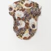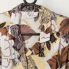 80s vintage floral blouse with shoulder pads. This 1980s shirt features a brown, mauve, green and yellow floral print, short sleeves, shoulder pads, a fabric button closure and an open collar. Made in England from a lightweight synthetic material.