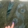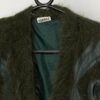 80s vintage fluffy forest green cardigan coat with leather appliqué. This 1980s cardigan coat in forest green features beautiful leather geometric appliqués on the front, a full length button closure, is fully lined and has shoulder pads. Made from a heavyweight mohair blend with a synthetic lining.