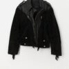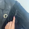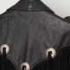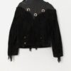 80s vintage fringed black leather suede jacket with metal details. This 1980s leather and suede black jacket features fringe detail on the arms, back and chest and cute silver metal detail on the chest, hem, back and shoulders. This jacket also features a full length zip closure, two side pockets and is made from a heavy weight leather and suede with a synthetic lining.