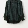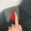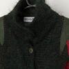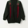80s vintage handknitted forest green and red fluffy mohair cardigan. This forest green cardigan features two unique red inverted box pleats on the front and back, a red and green suede shoulder detail, a full length green leaf button closure and is fully lined with a cute duck patterned material. Made from a heavyweight fluffy mohair and synthetic lining with a relaxed/oversized fit.
