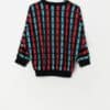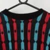 80s vintage sparkly batwing knitted jumper in blue and red. This black jumper features a sparkly red and blue geometric pattern, a crew neck, a batwing sleeve and is made in England from a lightweight synthetic material.