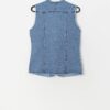 90s vintage denim vest in light blue. This 1990s light blue denim vest features a beautiful button closure, two faux chest pockets, has a V-neck and is made from a heavyweight synthetic material.