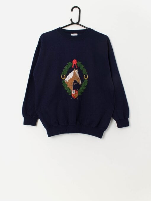 90s vintage horse embroidered navy sweatshirt. This 90s navy sweatshirt features a beautiful embroidered horse, a round neck, long sleeves and a super soft lining. Made in Great Britain from a mid-weight soft cotton blend.