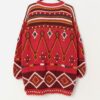 90s vintage Next cotton oversized jumper with wooden bead detail. This 1990s oversized red jumper by Next features an amazing multicoloured abstract design with wooden beads, a round neck and long sleeves. Made from a heavyweight soft cotton.