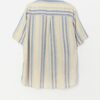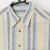 90s vintage striped shirt with short sleeves. This 1990s mixed blue and pastel yellow striped shirt features one chest pocket with a button closure, a full length button closure and short sleeves. Made from a lightweight pure silk.