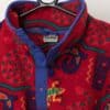 90s vintage women’s lizard graphic red fleece, made in USA. This bright red 90s fleece features a lizard and geometric pattern, two open side pockets, long sleeves, electric blue piping and a quarter button closure. Made from a mid-weight, soft synthetic material.