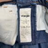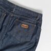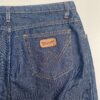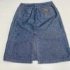 90s Wrangler indigo blue denim midi skirt. This 1990s skirt, named Kimberly by Wrangler, features a zip fly, a button closure, two open pockets below the waist and two open back pockets. Thee Wrangler logo is on the back right pocket and there is also a small split hem at the back. Made from a heavyweight cotton blend.