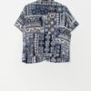 Blue and white floral blouse by Marks & Spencer. This soft blue, navy and white blouse features a floral and geometric pattern, short sleeves, a full length button closure and is made from a lightweight, soft synthetic material.