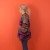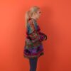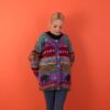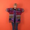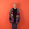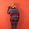 Colourful vintage striped cardigan with elephant pattern. This bold cardigan features a silver button closure, long sleeves, a loose crew neck and an amazing stripe and elephant pattern. Handknitted from a heavyweight, handspun pure wool.