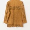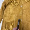 Deadstock 1980s vintage fringed suede jacket, mustard yellow. This mustard yellow 80s suede jacket features a V-neck collared neckline, a snap button closure, two open pockets above the hem and fringe detail on the shoulders, chest, pockets, back and hem. Made from a heavyweight suede with a synthetic lining.