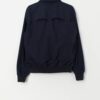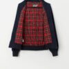 Fred Perry Harrington jacket in navy blue, made in England. This navy blue Harrington jacket by Fred Perry features the classic red tartan lining, a zip closure with a button closure on the neck, long sleeves and a stretchy hem. Made in England from a heavyweight cotton blend with a synthetic lining.