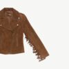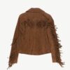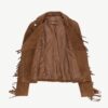 Fringed brown suede jacket by Freaky Nation. This jacket features fringed sleeves, two side pockets with zip closures, a full length zip closure, is lined and has a collared neckline. Made from a heavyweight soft suede with a cotton and synthetic blend lining.