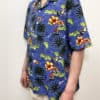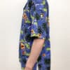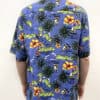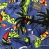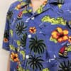 Mens bright vintage Hawaiian shirt with vibrant palm trees and hibiscus flowers and sail boats. Open lapel collar and button details.