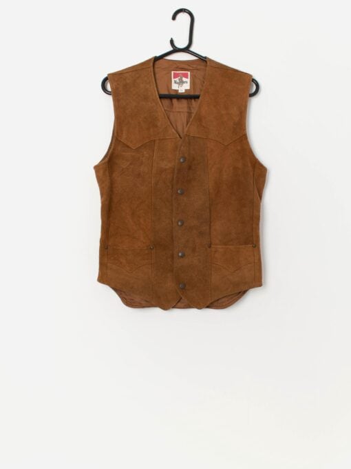 Men’s 70s vintage Marlboro suede waistcoat in tan. This 60/70s tan suede vest features a snap button closure, a V-neck, two open pockets above the hem and is fully lined. Made from a heavyweight suede with a synthetic lining.