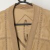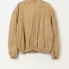 Men’s 80s vintage suede jacket with V-neck. This beige 1980s suede jacket features a deep V-neck, a button closure, two open side pockets and an inside pocket with a zip closure. Made from a heavyweight suede with a synthetic lining.