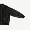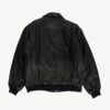 Mens black leather padded bomber jacket. This 80/90s jacket features a hidden zip and snap button closure, a collared neckline, elasticated navy knitted cuffs and hem, two large pockets above the hem with zip closures and two open side pockets. Made from a heavyweight leather with a cotton and synthetic blend lining and padding.