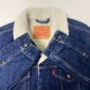 Men’s Levis blue sherpa denim trucker jacket with white collar. This indigo blue Levis trucker jacket features two chest pockets with snap button closures, two open side pockets and the Levis red tab is embroidered onto the left chest pocket. This jacket also features a snug white sherpa lining and collar, a snap button closure and is made from a heavyweight cotton with a synthetic lining.