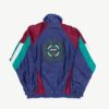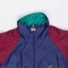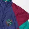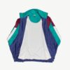 Shiny 80s vintage festival jacket with timeless graphic. This colourful colour block jacket features a high neck, a full length zip closure, two side pockets with zip closures and an elasticated hem and cuffs. Made from a mid-weight synthetic material with a cotton blend lining.
