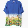 Mens vintage 90s Mambo Loud shirt designed Reg Mombassa. The amazing illustration on this shirt is commonly referred to as ‘Jesus on a Motorcycle’. Its one of the most classic and sought after mambo designs and it very rarely appears as a dead-stock unworn item with the original retail tags. Coconut buttons (including spare), with top button concealed under collar. Be the envy of your mates, and be mambo loud. Rare small size, which can suit anyone up to a Large depending on how you want to to fit, as they are designed to be oversized and baggy.