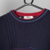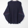 Mens vintage knitted sports style pullover in navy blue with red green and purple accents.