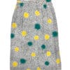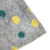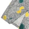 Multicoloured abstract print midi skirt with a white background with navy specks and bright paint splatters of lemon yellow and teal.