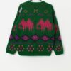 Oxbow green ski sweater made in France, Pohono. This amazing Oxbow (style name Pohono) features a pink and purple geometric design on the front, back and sleeves. This jumper also features the Oxbow label on the back left shoulder, a stretchy crew neck and a stretchy hem and cuffs for the best fit. Made in France from a heavyweight, soft wool and synthetic blend.