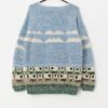 Pachamama handknitted jumper with sheep and cloud design. This beautiful Pachamama jumper features sheep in a meadow under a blue sky and white clouds. This jumper also features a round neck, long sleeves and is handknit in Nepal from a heavyweight, slightly coarse, wool and mohair blend.