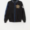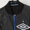 Knitted side – This rare 1980s jacket features a large gold Umbro printed logo on the left of the chest, the Umbro crown logo is on the right arm and a large logo is printed on the back. This jacket also features a stretchy crew neck, cuffs and hem and a full length zip closure.