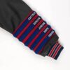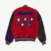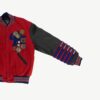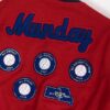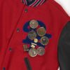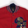 Rare American personalised red varsity jacket with volleyball medals and patches by Holloway Original. This amazing jacket features a stretchy knit collar, cuffs and hem, leather sleeves, a snap button closure, two open pockets, is fully lined and is decorated with various volleyball medals! Made in the USA from a heavyweight leather, wool and synthetic blend.