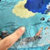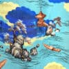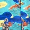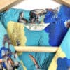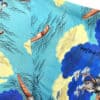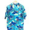 This lovely shirt is made from 100% rayon and features a stunning pattern with a light blue background with ocean landscape including long boats, clouds and rocks. The collar can be worn open or closed. The buttons are pretty fancy too and are made from metal. The label reads “Hookano S brand, Made in Hawaii”. Size XS/S.