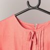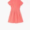 Vintage 1960s St Michael dress in salmon pink with lovely original label (pre Marks & Spencers). The fabric has a very subtle vertical line pattern. The dress has a nipped-in waist with box pleats and features vertical panelling, buttons (decorative) and a bow at the front. The dress fastens with a zip at the back and is a really striking colour!
