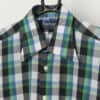 Vintage 70s colourful plaid shirt, deadstock. This black, green, blue and white plaid 1970s shirt features a dagger collar, an off white button closure and short sleeves with a button adjustment. Made from a lightweight cotton blend.