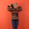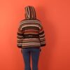 Womens vintage 70s St Michael hooded jumper in orange, brown and beige stripes. This jumper features a large hood, a toggle closure on the neck and a waist tie. Made in the UK from a mid-weight synthetic material.