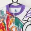 Vintage 90s cycling jersey with abstract graphic. This 1990s cycling jersey features a purple, yellow, black and red bright abstract graphics and the spell out “Bike Action” on both arms. This cycling jersey also features a zip closure, three pockets on the back and is made from a lightweight synthetic material.