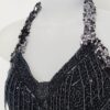 Vintage beaded halter neck in navy blue. This stunning navy blue halter neck features a bead and sequin pattern, built in padded cups, beaded fringe detail, and a tie black closure. Made from a heavyweight synthetic blend.