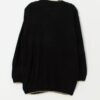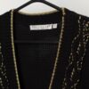 Vintage black and gold cable knit cardigan. This amazing black 90s cardigan features a gold geometric pattern on the front and gold piping. This cardigan also features a deep V-neck, a black button closure, has light shoulder pads and is made from a heavyweight soft synthetic material with a relaxed fit.