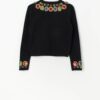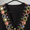 Vintage black beaded cardigan with stunning multi-coloured faux jewels. This beautiful cardigan is in a deep black with faux jewels in blue, red and green and gold beads around the cuffs and down the opening. A stunning piece that will level up any outfit! Made from a soft, lightweight material.