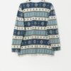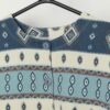Vintage blue and cream patterned jacket. This women’s 1970/80s patterned jacket in pastel blue, navy, cream and brown features a round neck, a button closure and two pockets above the hem. Made from a lightweight cotton blend.