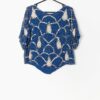 Vintage blue silk top with silver sequins and faux pearl teardrop pattern. The swirly pattern of the beading and large faux pearl teardrops are simply mesmerising. Beautiful top with amble vintage character.