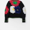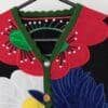 Vintage bold appliqué floral cardigan. This gorgeous black cardigan features a forest green trim, red, royal blue and white flowers across the front, backs and arms. This cardigan also features amazing buttons, a V-neck, stretchy, folded sleeves and is made from a heavyweight, soft synthetic blend.