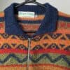 Vintage bright cardigan coat. This beautiful pink cardigan features a bold and bright abstract design in red, green, yellow, orange and blue. This cardigan also features a blue collar and a full length zip closure. Circa 1990. Designed in Ireland and made from a lightweight wool and polyamide blend.