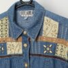 Vintage denim chore shirt tunic blouse with jewel detail. This 90s/Y2K oversized chore shirt / tunic blouse in denim blue features a brown and pastel yellow shoulders with jewel details. This shirt also features a button closure, buttoned cuffs and three pockets above the hem. Made from a mid-weight cotton shirt.