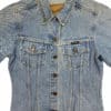 Vintage denim Wrangler jean jacket in a lovely light-medium blue wash. It is a really unique fitted shape and the bottom hem is cut more like a shirt style. There are two front chest pockets with button closures & the classic Wrangler mini patch, it also features a pointed 70s style collar. The jacket seems to be in great vintage condition except a little discolouration to the right hand collar, which you can see in the photos.